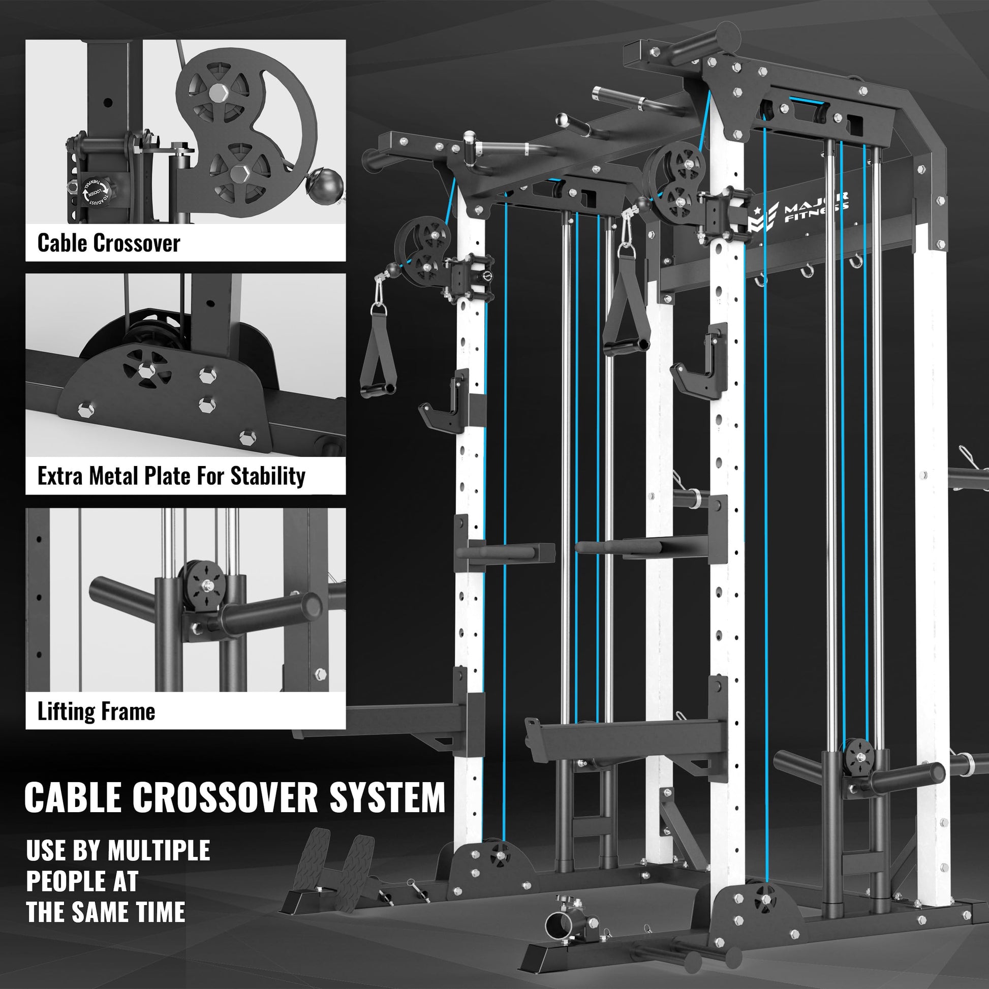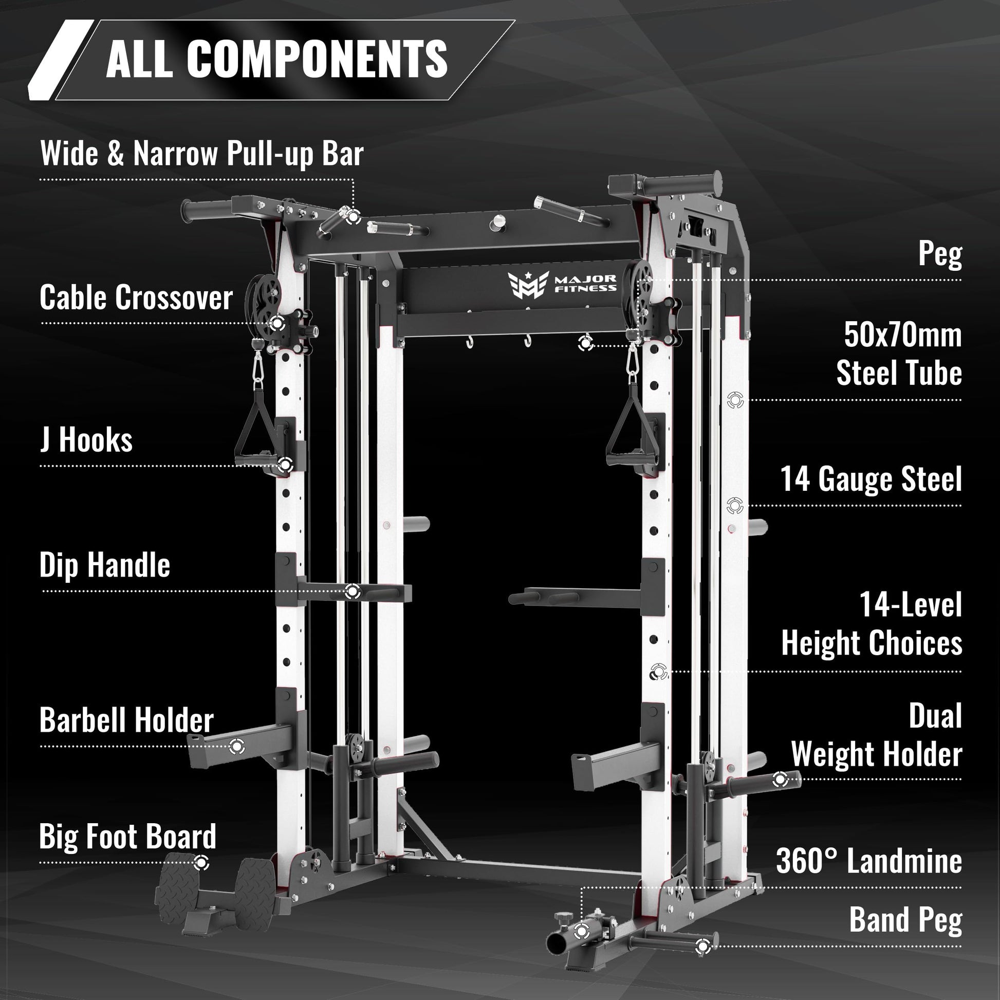 - Comprehensive Set of Exercise Accessories: Equipped with safety arms, foot pedals, J-hooks, landmine attachment, dip bars, T-bars, LAT pulldown bar, cable bars, and resistance band pegs. These accessories enable a wide range of exercises targeting various muscle groups, maximizing your workout potential