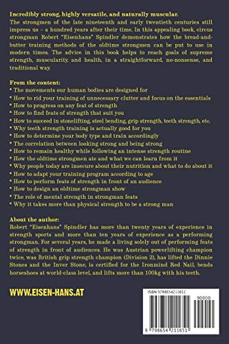 Details: Incredibly strong, highly versatile, and naturally muscular – the strongmen of the late nineteenth and early twentieth century still impress us a hundred years after their time. In this appealing book, circus strongman Robert “Eisenhans” Spindler demonstrates how the bread-and-butter training methods of the oldtime strongmen can be put to use in modern times to reach goals of supreme strength, muscularity, and health, in a straightforward, no-nonsense, and traditional way. From the content:•The movement our human bodies are designed for•How to rid your training of unnecessary clutter and focus on the essentials•How to progress on any feat of strength•How to find feats of strength that suit you•How to succeed in stonelifting, steel bending, grip strength, teeth strength, etc.•Why teeth strength training is actually good for you•How to determine your body type and train accordingly•The correlation between looking strong and being strong•How to remain healthy while following an intense strength routine•How the oldtime strongmen ate and what we can learn from it•Why people today are insecure about their nutrition and what to do about it•How to adapt your training program according to age•How to perform feats of strength in front of an audience•How to design an oldtime strongman show•The role of mental strength in strongman feats•Why it takes more than physical strength to be a strong man About the author: Robert “Eisenhans” Spindler has more than twenty years of experience in strength sports and more than ten years of experience as a stage strongman. For several years, he made a living solely out of performing feats of strength in front of audiences. He was Austrian powerlifting champion twice, was British grip champion (Division 2), has lifted the Dinnie Stones and the Inver Stone, is certified for the Ironmind Red Nail, bends horseshoes at world-class level, and lifts more than 100kg with his teeth.