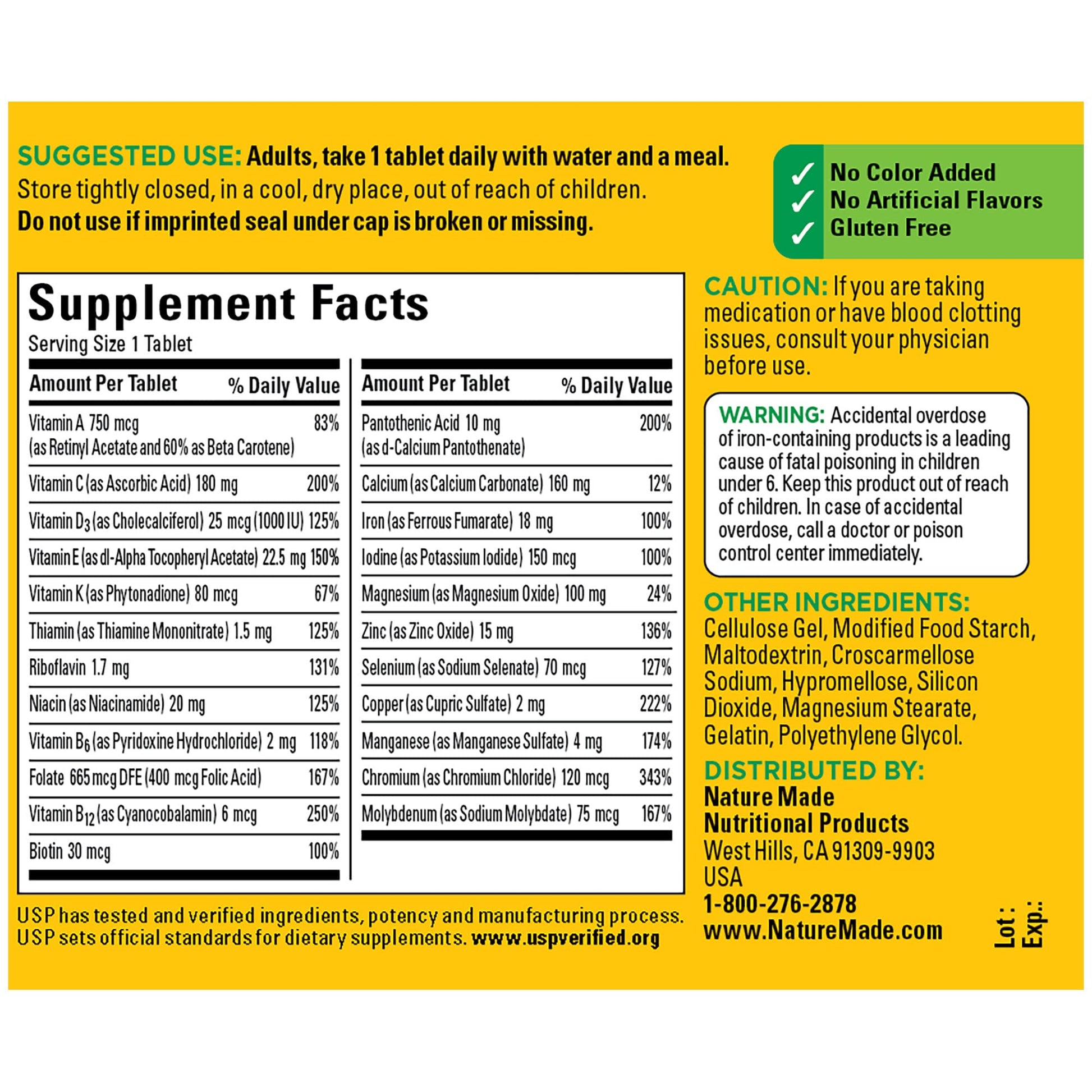 Details: Nature Made Multivitamin with Iron Tablets help support immune health, muscle and bone health, and energy metabolism(1). Made in the USA with quality global ingredients, these adult multivitamin tablets contain no color added, no artificial flavors, and are gluten free. This Nature Made Multi is a dietary supplement that contains 23 key nutrients, including Vitamin A, Vitamin C, Vitamin D3, Vitamin E, and Iron for daily nutritional support. These adult multivitamins with Iron are a great choice for people who want to fill potential nutrient gaps in their diet. Adults, take one tablet daily with water and a meal. Nature Made supplements are quality you can trust. USP has tested and verified ingredients, potency, and manufacturing process. USP sets official standards for dietary supplements. Visit the USP verified website for more information. (1)Helps convert food into cellular energy.