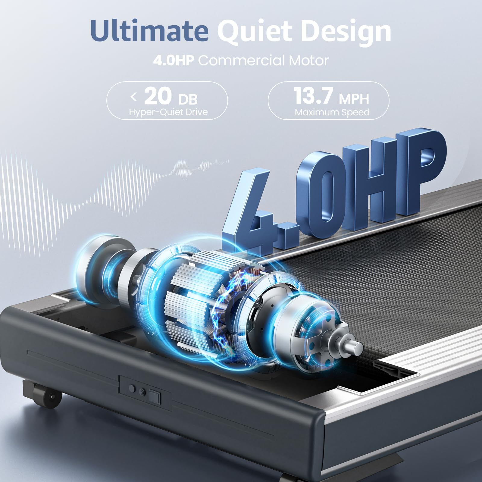 - 4 HP Motor: Develop with quiet smooth operation, 4 HP powerful motor controls the sound at lower than 20dB and provides speeds up to 13.7 MPH. This treadmill allows effective cardio training without disturbing others or family