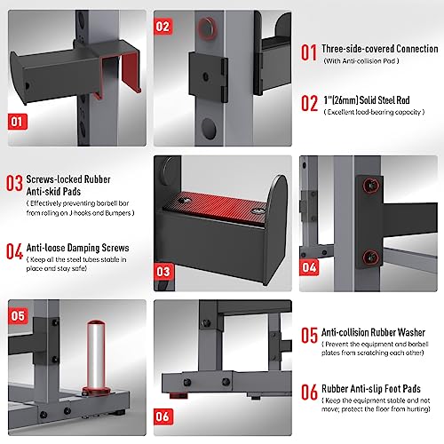 - 【 More Excellent Features 】- All the screws are damping screws, which are anti-loose and wear-resistant; With 4 anti-slip pads under the equipment, keep stable and protect the floor; With 2 barbell plate storage columns, the size is 50mm(2”), suitable for barbell plates with 50mm (2”) center hole.