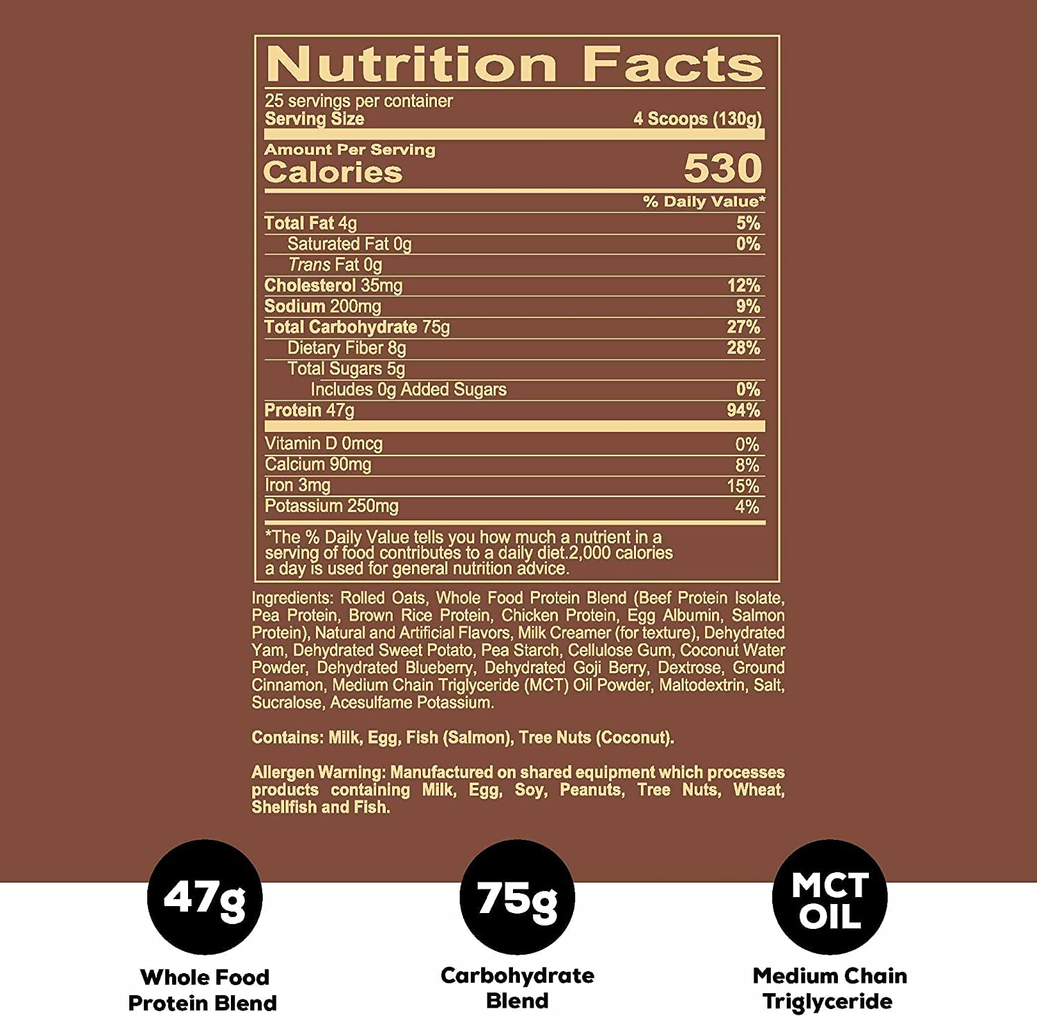 - Professional Grade Formula - REDCON1's MRE protein powders contain a whole food high protein blend of beef, salmon, chicken, egg, brown rice and pea protein powders. Each meal replacement protein powder shake is 530 calories with 47g of protein and only 5g of sugar in your new favorite meal replacement powder.