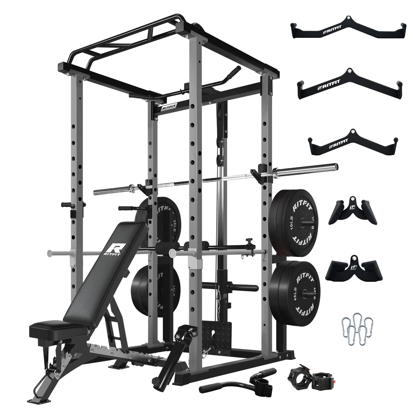 RitFit Squat Rack Power Cage Home Gym Package, Includes 1000LBS Power Rack with LAT Pull Down, Weight Bench, Rubber/Bumper Plates Set with Olympic Barbell (Package 1.9K (Bumper Plate 340LBS))-Grey