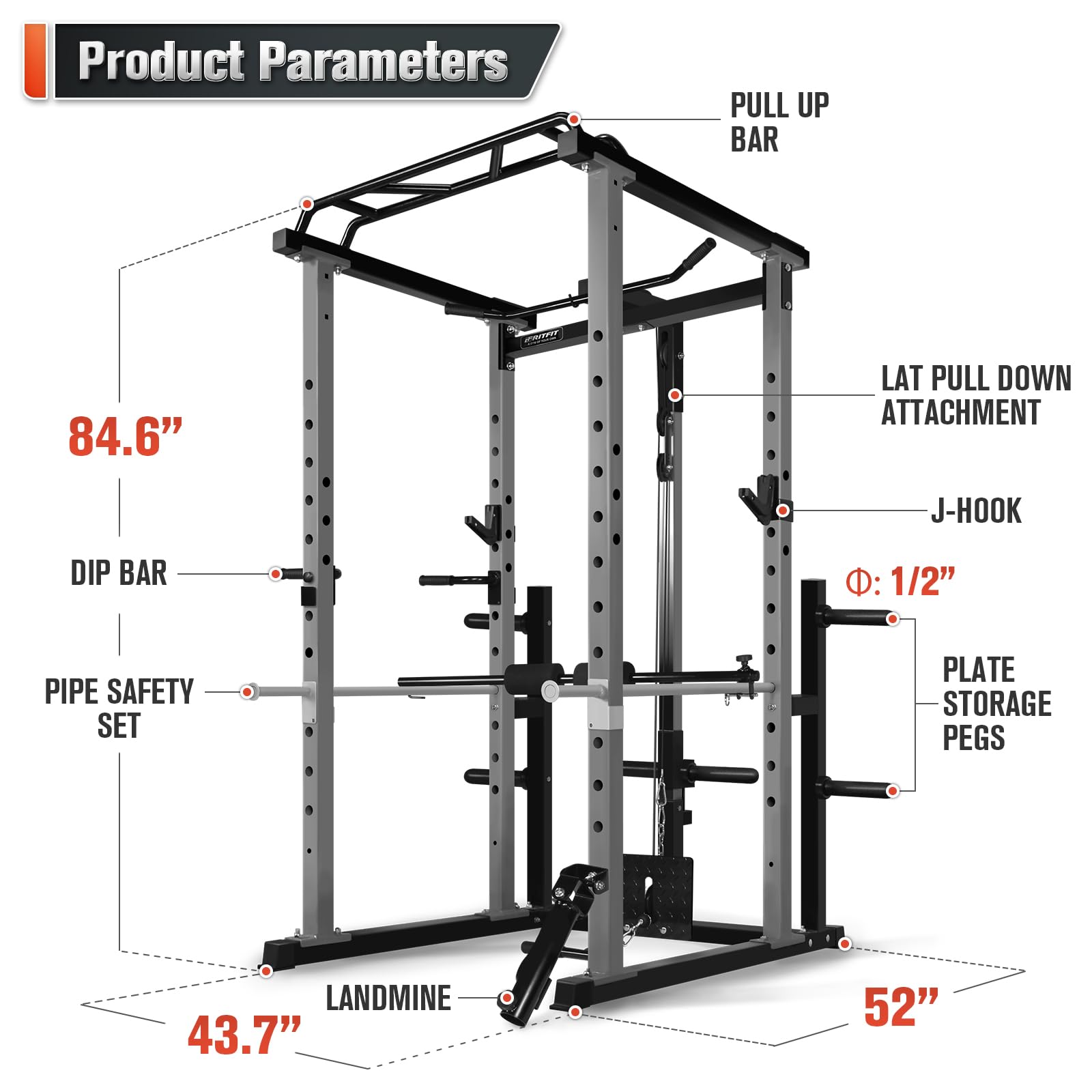 - Unlimited Home Gym Workouts - Equipped with a lat pull down system(high and low pulley) and 13 extra accessories for free(safety bars, J-cups, dip handles, weight holder pegs, pull up bar, T-bars for rowing, Landmine attachments, leg hold-down), it allows you to perform numbers of movements.