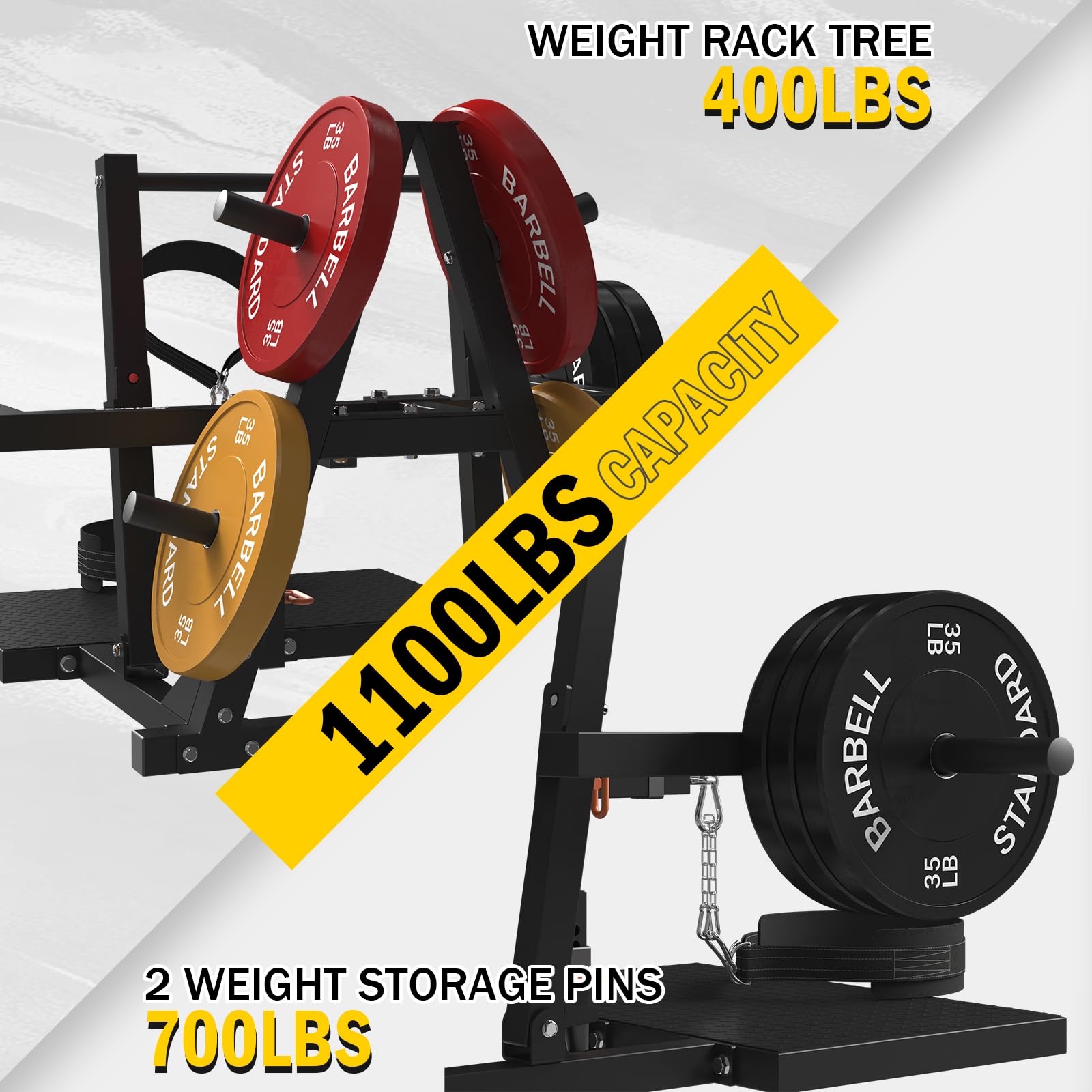 - 【Space Manage】Considering to provide best experience for fitness enthusiasts to adjust squat weight and organize own home gym, so we added a weight plate storage rack to the design of the machine, four plate pins can each hold four standard weight plates of 25 lbs. More space, more neatly arranged.