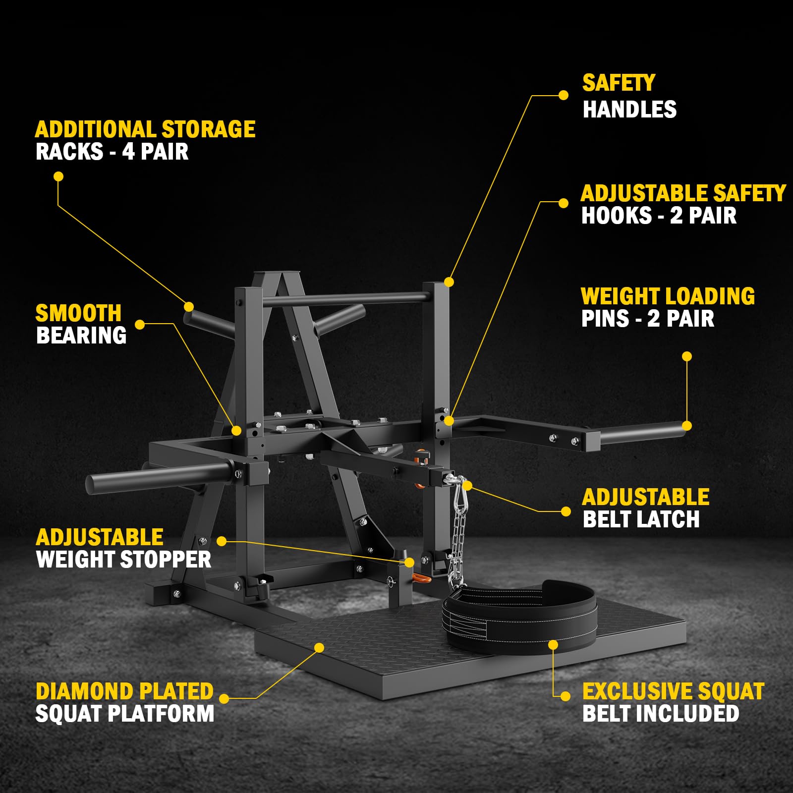 - 【Squat Helper】There is no doubt that squat is such a good way to build lower body. Additional squat with back pain or muscle soreness would be difficult, therefore the hip belt with the squat machine could solve this problem effectively. Different from traditional squat, the hip belt squat with our unique anatomy to lift more weight with less risk of injury. This squat machine focuses on quads, glutes, and hamstrings more effectively than traditional squats.