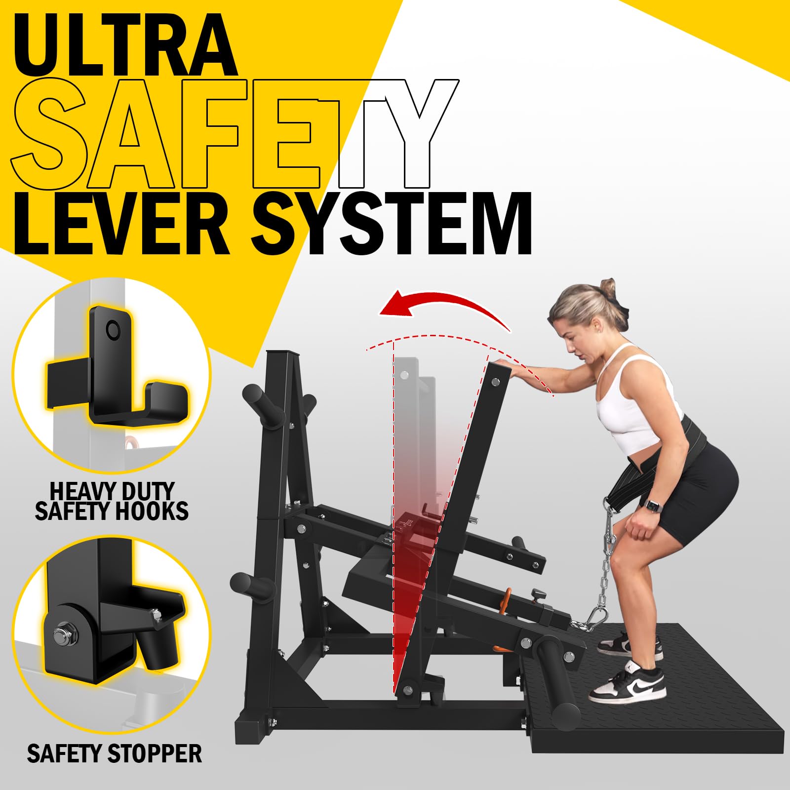- 【Safer Security】Gritted pedals provide a non-slip surface for better grip, allowing for greater control and safety when squatting. The addition of 3 weight stop positions makes it easy for adjusting the height of your squat to fit different heights while avoiding equipment smashing and protecting your personal safety.