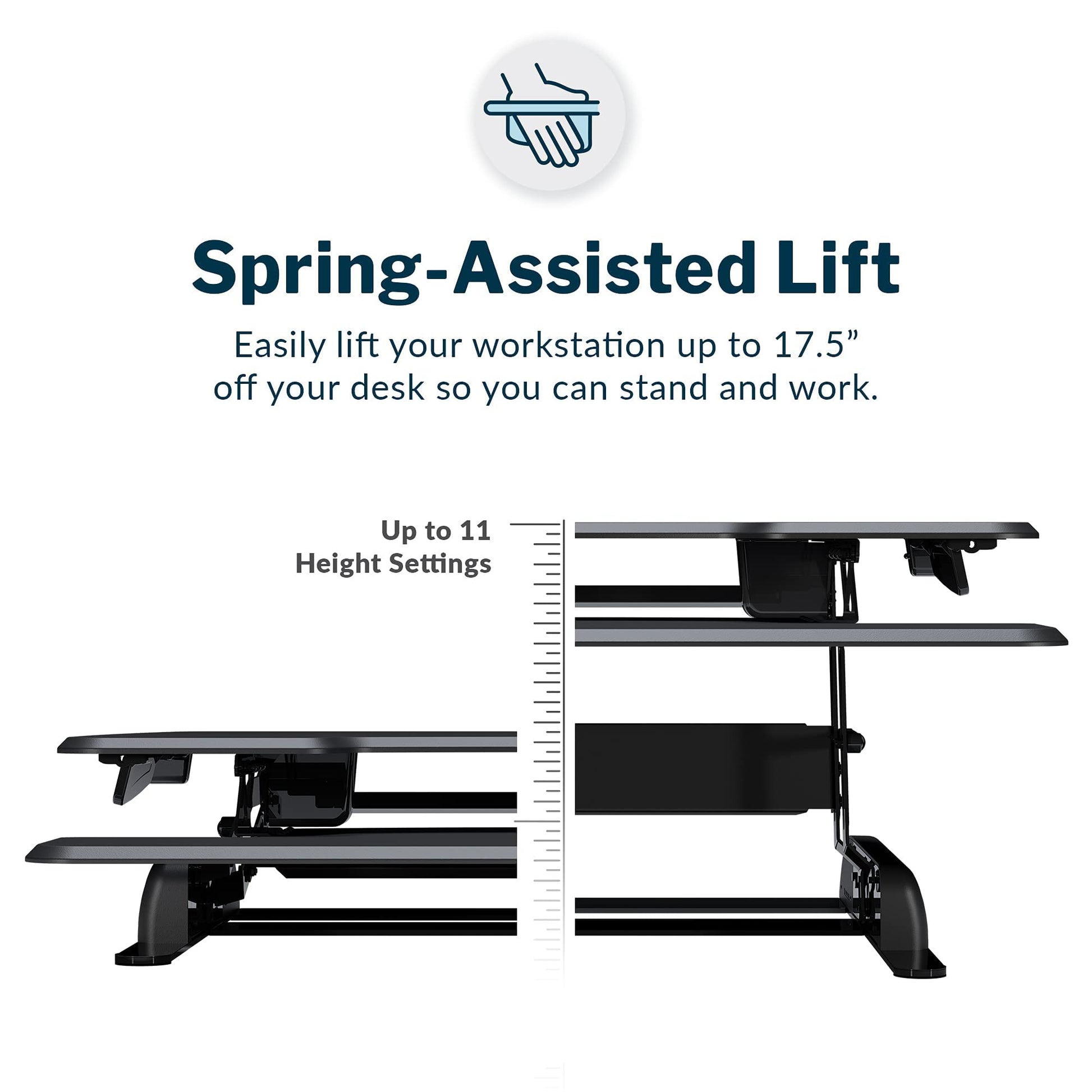 - Dual-Handle Lift: Engineered for your safety and ease, the dual-handle spring-assisted lift allows for quick and easy height adjustment. Effortlessly raise or lower your ergonomic desk riser to one of the 11 height settings, raising up to 17.5" off your wide desk lift.