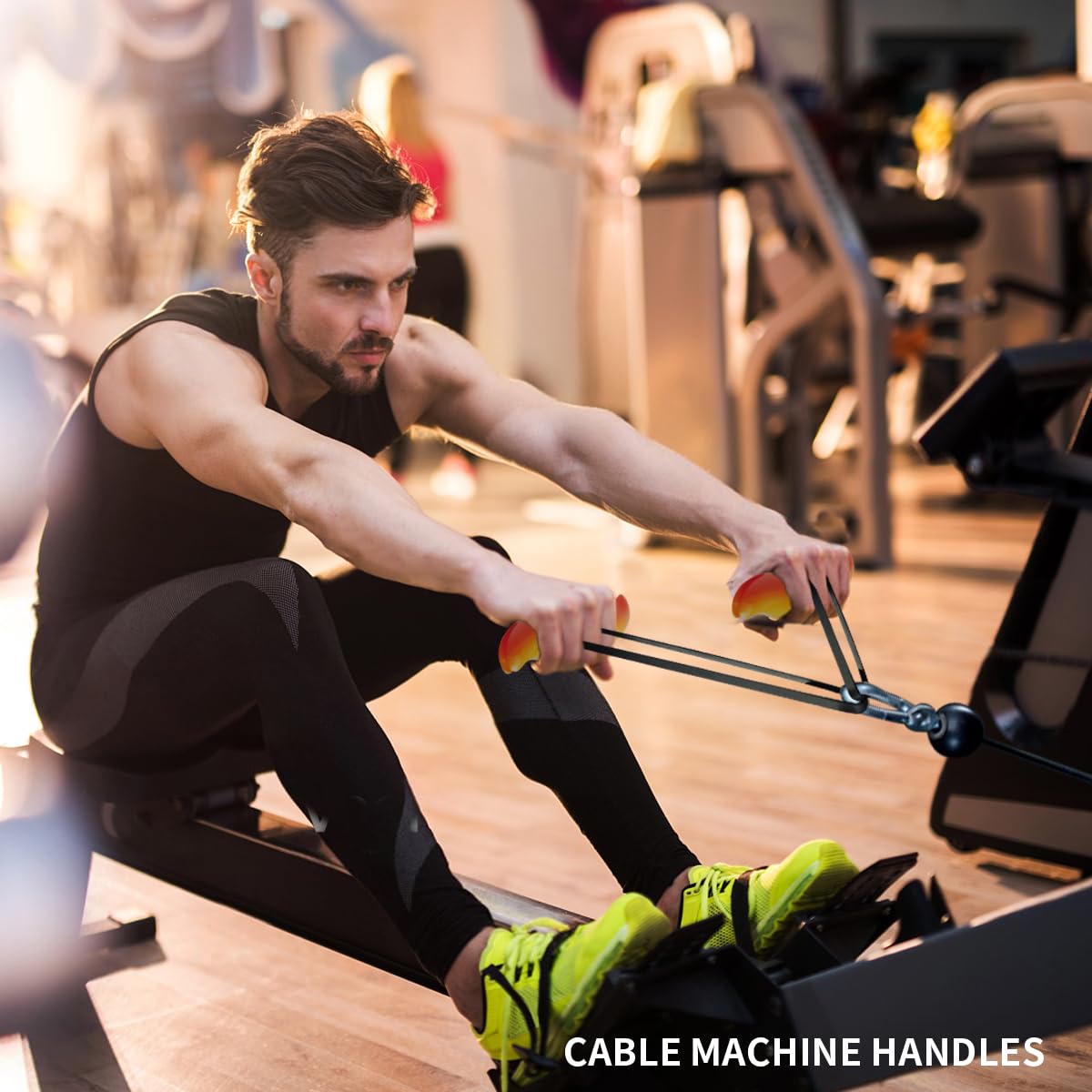 - [WIDELY USED] This exercise machine handle grips is suitable for cable machines, pull-up bars, barbells, rowing machines, flat-pull machines, resistance bands, Pilates reformers, weight pulleys, functional training equipment, chair gym, home gym and so on. The lightweight product comes with a small bag so you can carry it anywhere. Portable and easy to store.